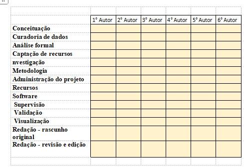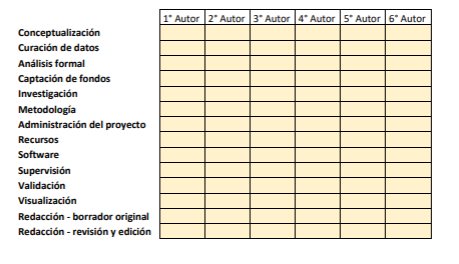 Indicando: Conceptualizaciòn; Curaciòn de datos; Anàlisis formal; Captaciòn de fondos; Investigaciòn; Metodologiìa; Admisnitraciòn del proyecto; Recursos; Software; Supervisiòn; Validación; Visualización; Redacción - borrador original; Redacción - revisión y edición